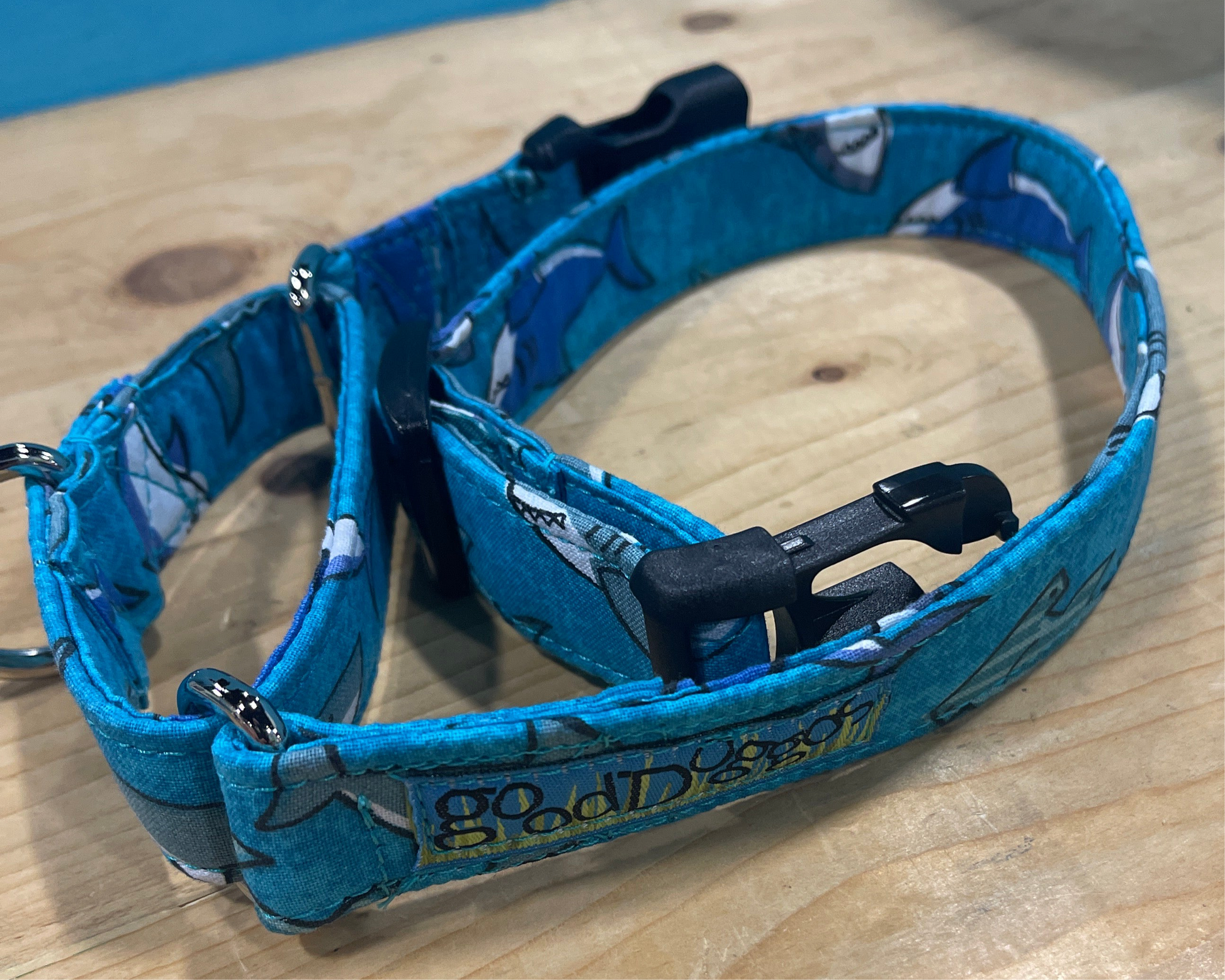 Dive into style and safety with the Sharks Martingale Collar! Crafted with a sturdy polypropylene core and four layers of cotton, this collar offers both durability and comfort. Its welded D-ring and rectangles keep it secure during your pup’s adventures, while the toothy makos and cheerful little hammerheads add playful shark-themed charm. Perfect for keeping your furry friend safely in control with a splash of oceanic fun.